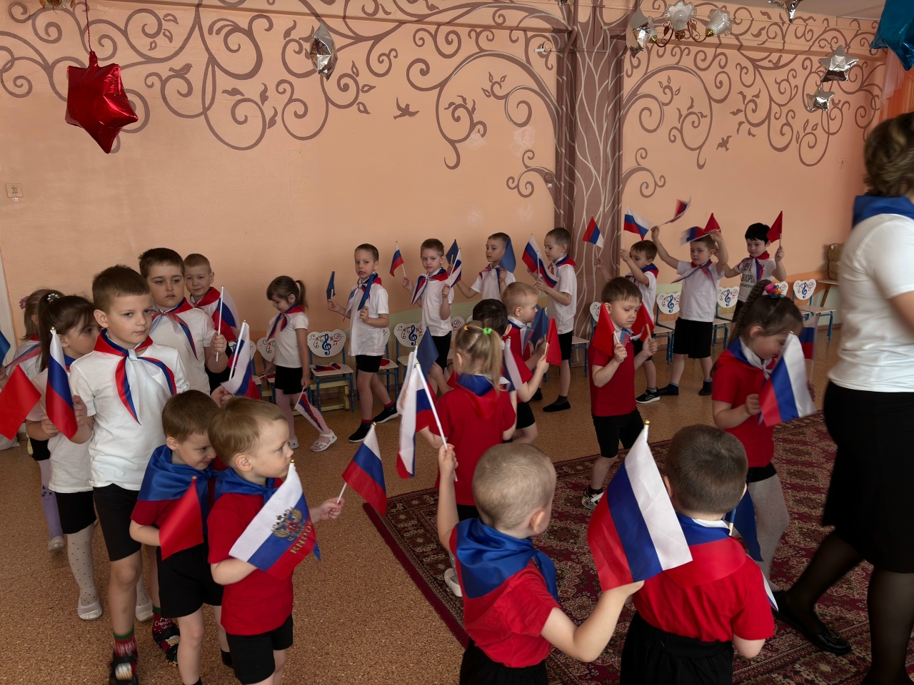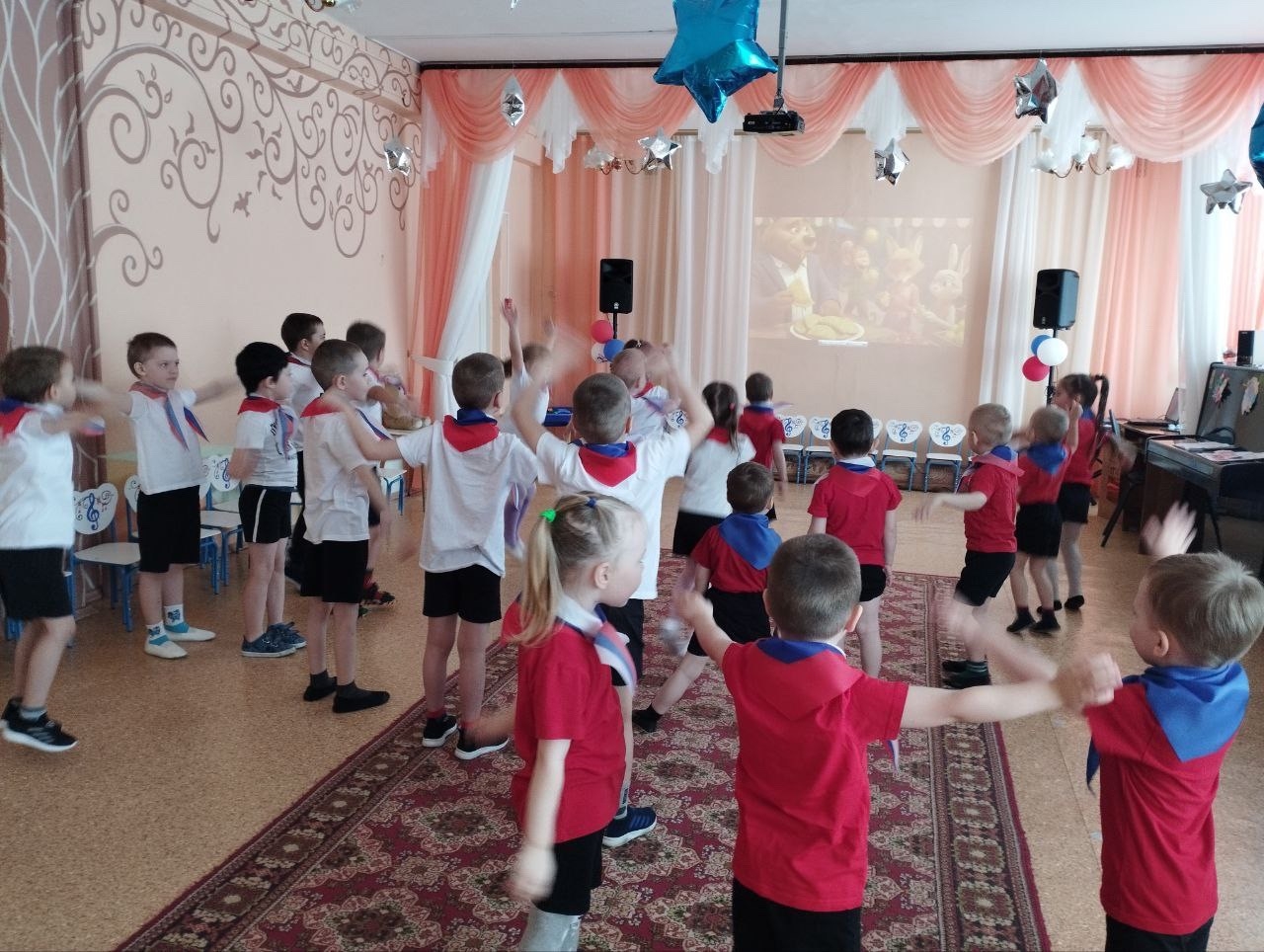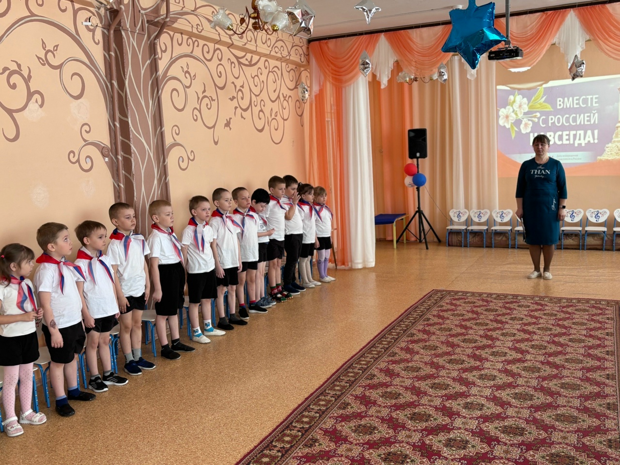 Праздник прошёл в яркой и эмоциональной атмосфере. Дети были одеты в белые и красные футболки, а дополняли образы шейные платки в цветах российского флага, создавая ощущение единства и общей причастности к событию. С первых минут было заметно, что происходящее вызывает у ребят живой интерес и искренние эмоции.