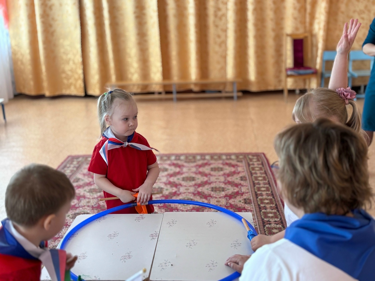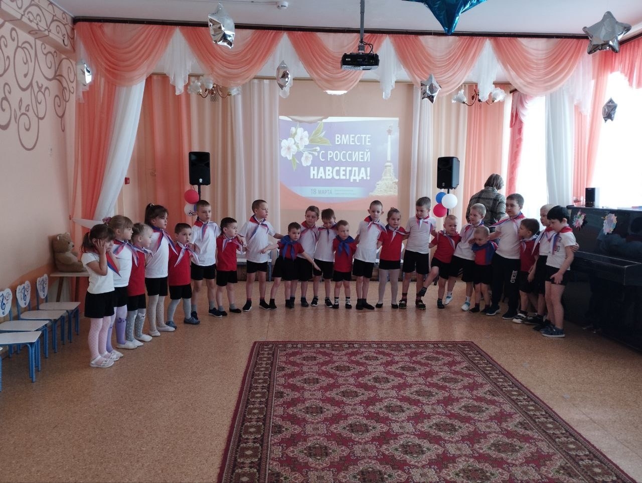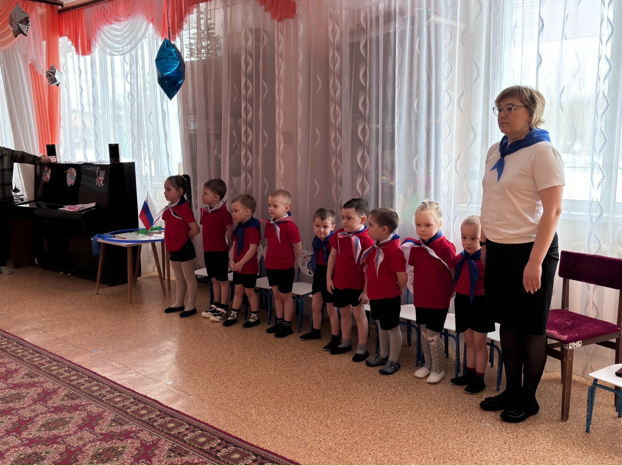 Праздник прошёл в яркой и эмоциональной атмосфере. Дети были одеты в белые и красные футболки, а дополняли образы шейные платки в цветах российского флага, создавая ощущение единства и общей причастности к событию. С первых минут было заметно, что происходящее вызывает у ребят живой интерес и искренние эмоции.