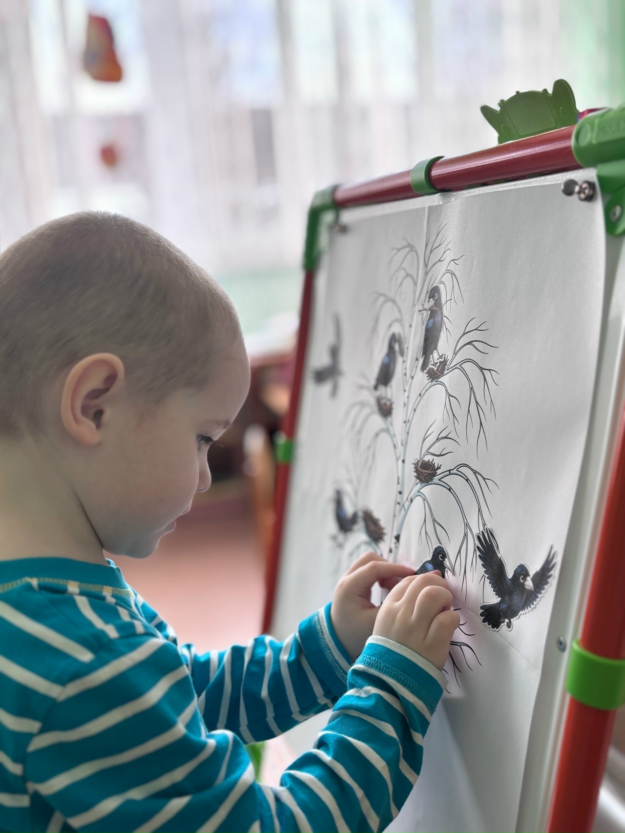 Значимым элементом занятия стало обсуждение сезонных изменений. Малышам объяснили, почему грачи покидают родные края в холодное время года и возвращаются с первыми тёплыми днями. Таким образом, дети смогли увидеть связь между изменениями в природе и поведением птиц, что сделало занятие не только познавательным, но и наглядным.