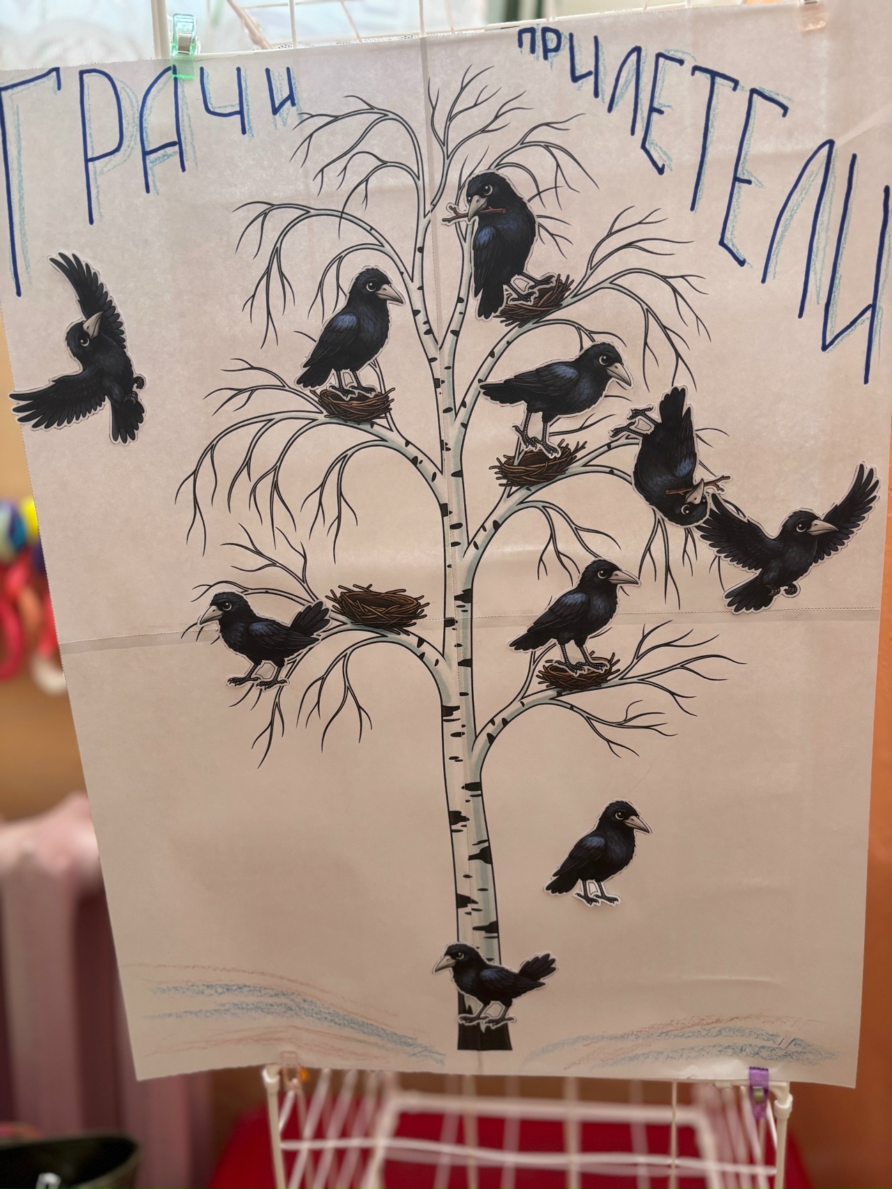 Завершилось мероприятие творческой частью. Дети выполнили коллективную аппликацию, изобразив грачей, расположившихся на ветвях берёзы. Каждая работа стала отражением детского восприятия весны — яркого, тёплого и наполненного жизнью. Готовая композиция украсила группу и стала своеобразным напоминанием о пробуждении природы.