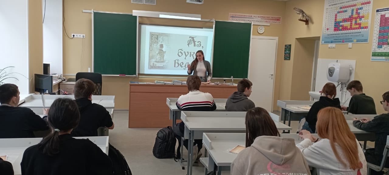20 ноября учащиеся 9-го класса Куркинской школы №2 приняли участие в мероприятии Куркинского краеведческого музея «Аз, буки, веди» по Пушкинской карте. Ребята перевоплотились в учеников церковно-приходской школы и на практике попробовали писать тексты пером и чернилами — как это делали их предшественники на кириллице и глаголице.