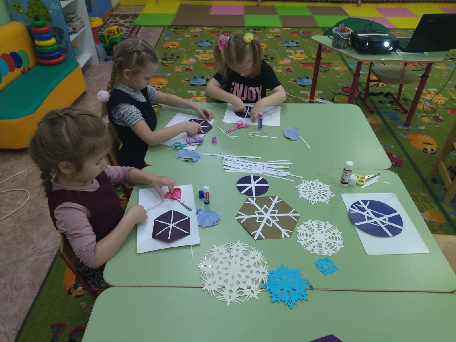 Творческая деятельность стала важной частью недели. В процессе рисования дети передавали своё представление о зиме, отражая в работах заснеженные пейзажи и зимнее настроение. На занятиях по аппликации были созданы волшебные снежинки — каждая из них получилась уникальной, наполненной детской фантазией и старанием.